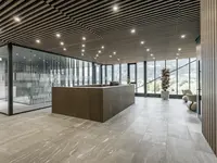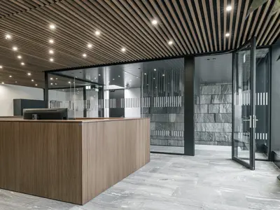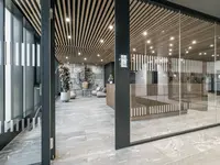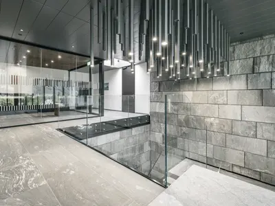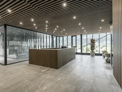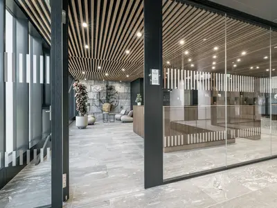 Das Structural Glazing-System erfüllt EI30 bis EI90 mit flächenbündig verklebtem CONTRAFLAM-Glas in Aluminiumkonstruktion. Überlaminierte Türrahmen und verdeckte Profile ermöglichen elegante Übergänge und gestalterische Freiheit bei hoher Sicherheit.