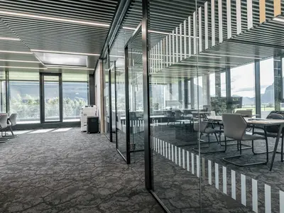Das versetzbare Trennwandsystem in Aluminiumbauweise führen wir als ständerlose Ganzglaskonstruktion mit filigranen Boden und Deckenprofilen aus. Diese Konstruktionsart ermöglicht Ihnen ein Maximum an Gestaltungsmöglichkeiten und Flexibilität. -