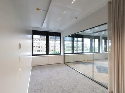 Das Trennwandsystem mit Zweischeiben-Verglasung wird als rahmenlose Ganzglaskonstruktion ohne vertikale Profile ausgeführt. Die Verglasung wird von Boden- und Deckenprofilen gehalten, fügt sich flächenbündig ein und erfüllt höchste Anforderungen an Transparenz und Schallschutz.